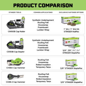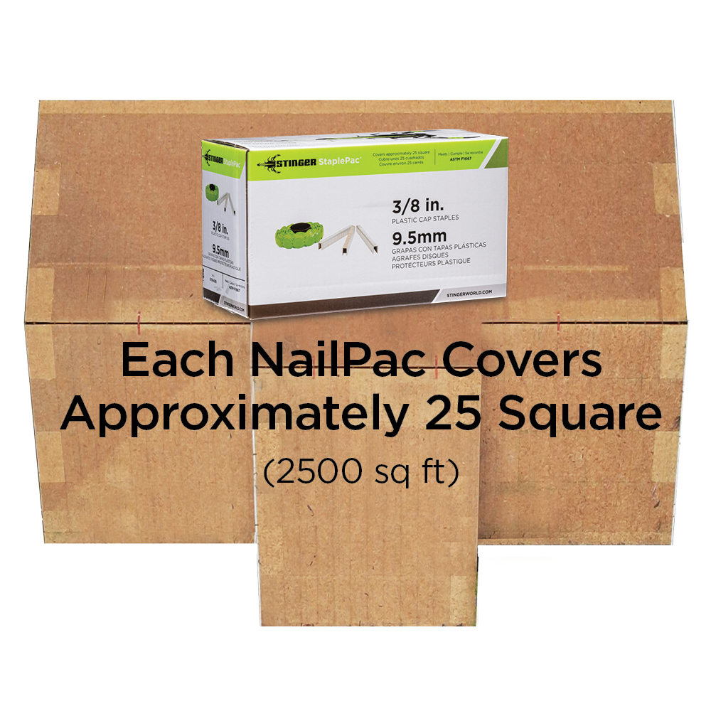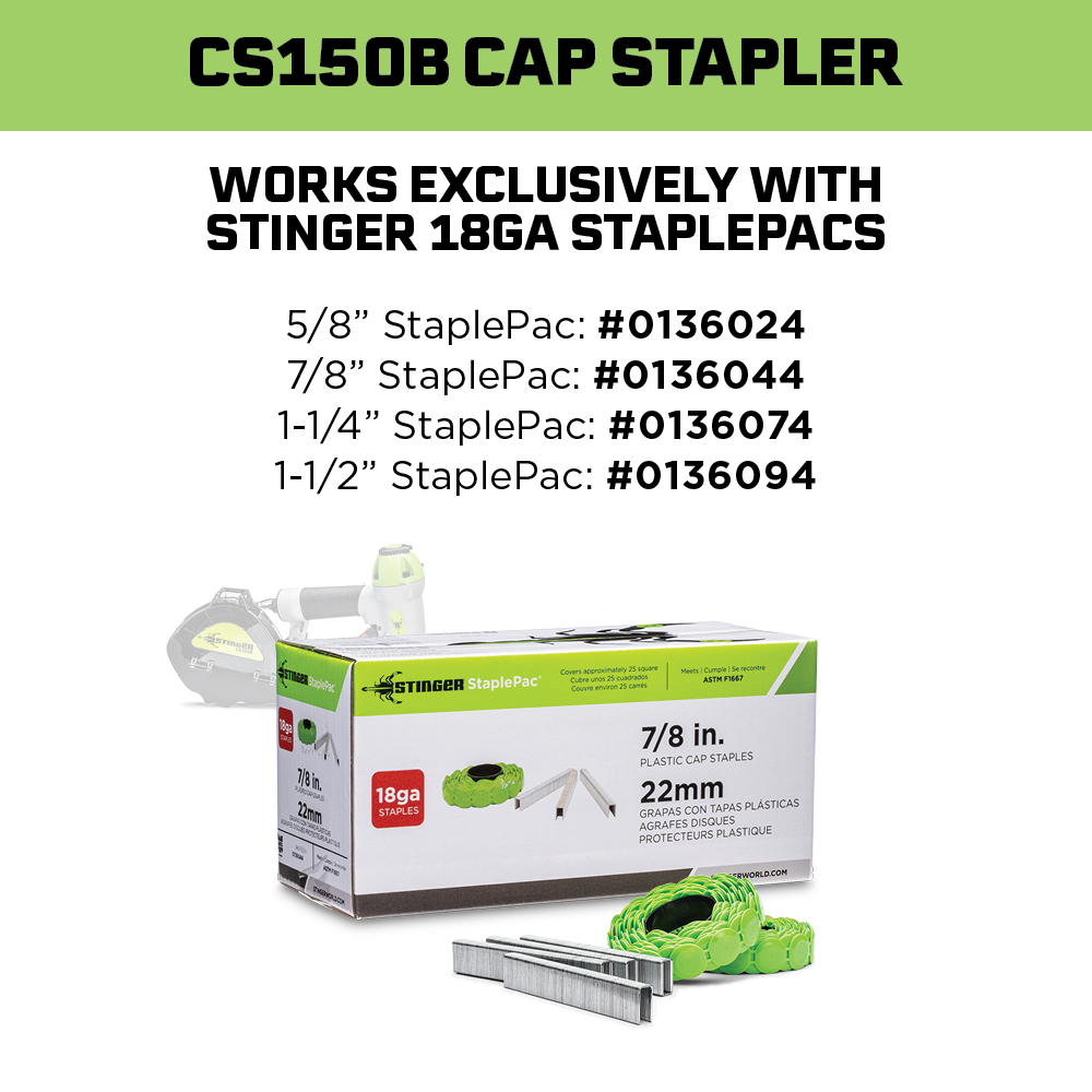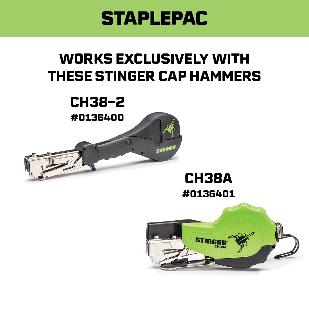 Cap Staples are recommended best practice for house wrap and roofing underlayment, as they provide a larger holding surface than standard staples. This helps prevent tearing, improves material retention, and ensures a more durable and weather-resistant installation. The STAPLEPAC® system is specifically designed for use with the STINGER® CS150B Cap Stapler. When used together, they deliver consistent fastening, reliable performance, and optimal results for professional-grade applications.