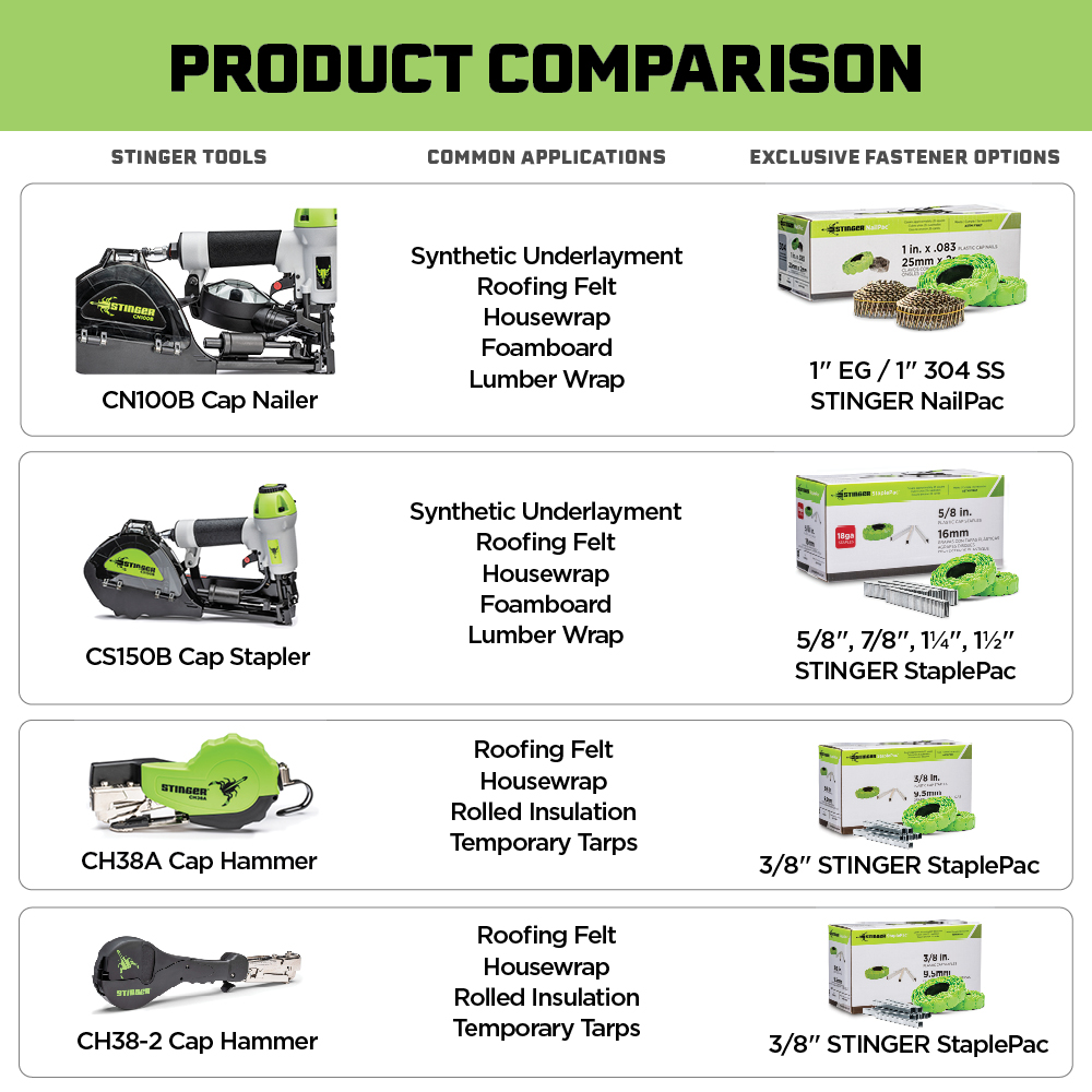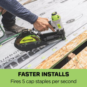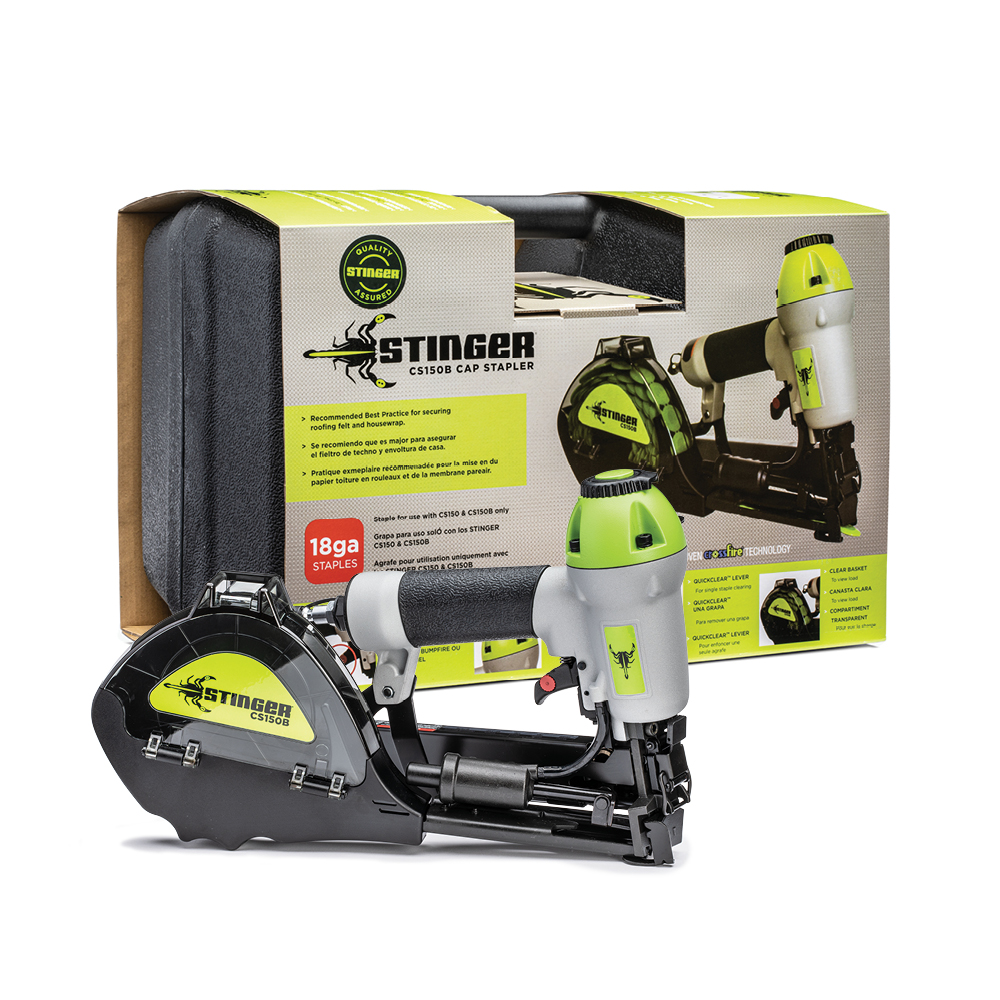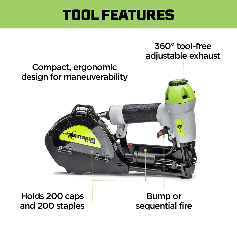 CS150B Cap Stapler is a high-performance pneumatic tool designed for efficient and secure installation of roofing underlayments, housewraps, foam board, and roofing felt. Building upon the success of its predecessor, the CS150, this upgraded model offers enhanced features to improve job site productivity and user comfort.