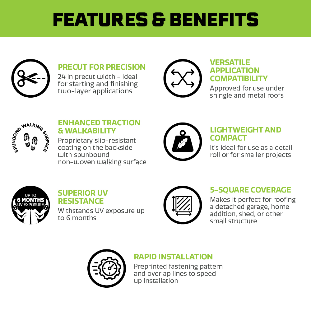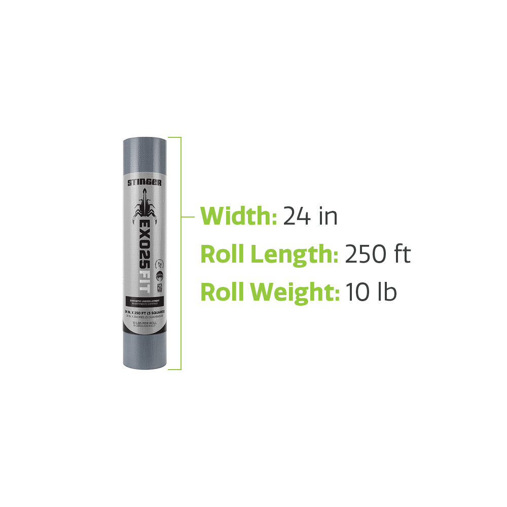 EXO25 FIT™ Synthetic Roofing Underlayment is a premium, half-width underlayment specifically designed for starting and finishing two-layer underlayment installs. Its 24″ x 250′ dimensions make it ideal for precise applications, ensuring a secure and efficient installation. Engineered with a spunbound non-woven walking surface and a proprietary slip-resistant backside coating.