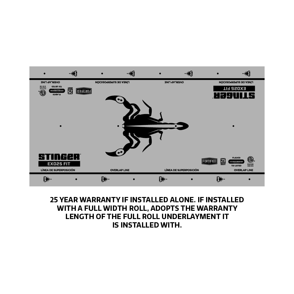 - EXO25 FIT™ adopts warranty length of the full roll underlayment it is installed with.