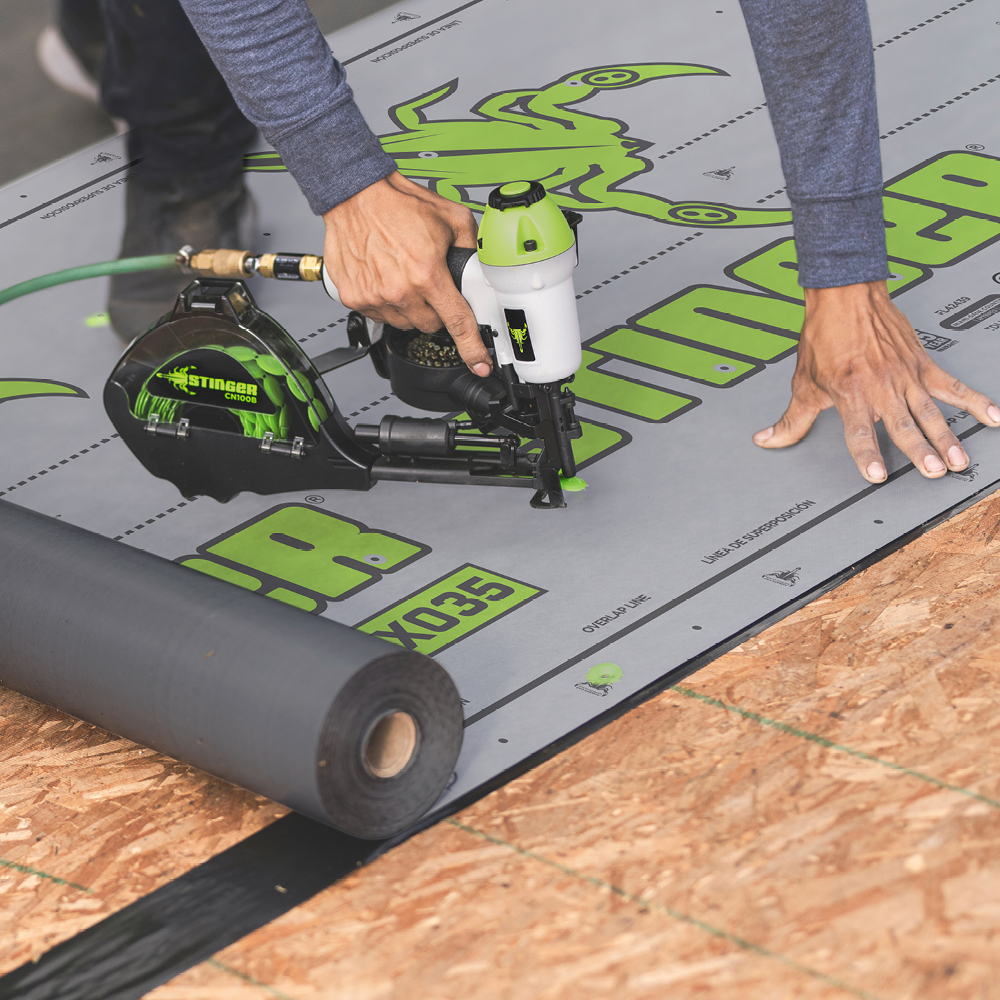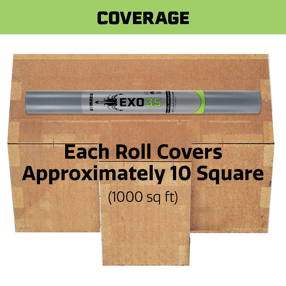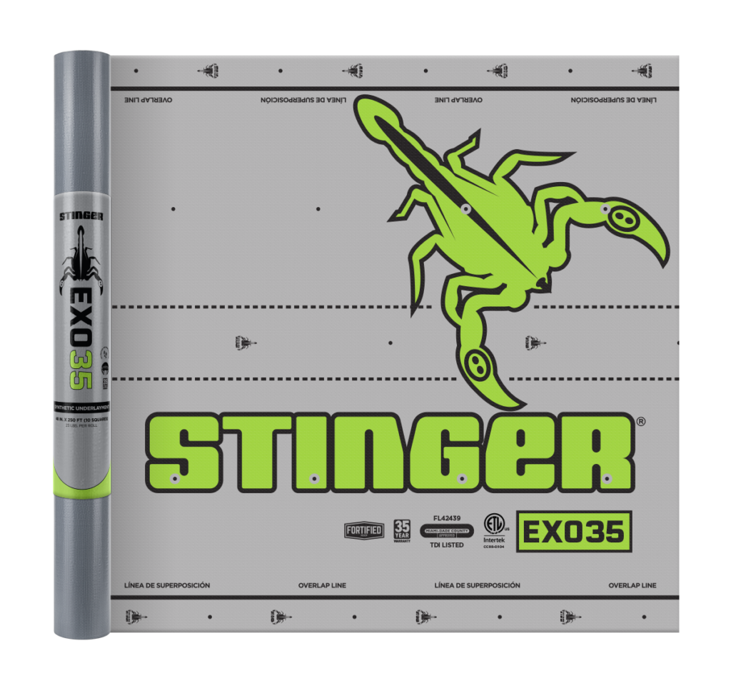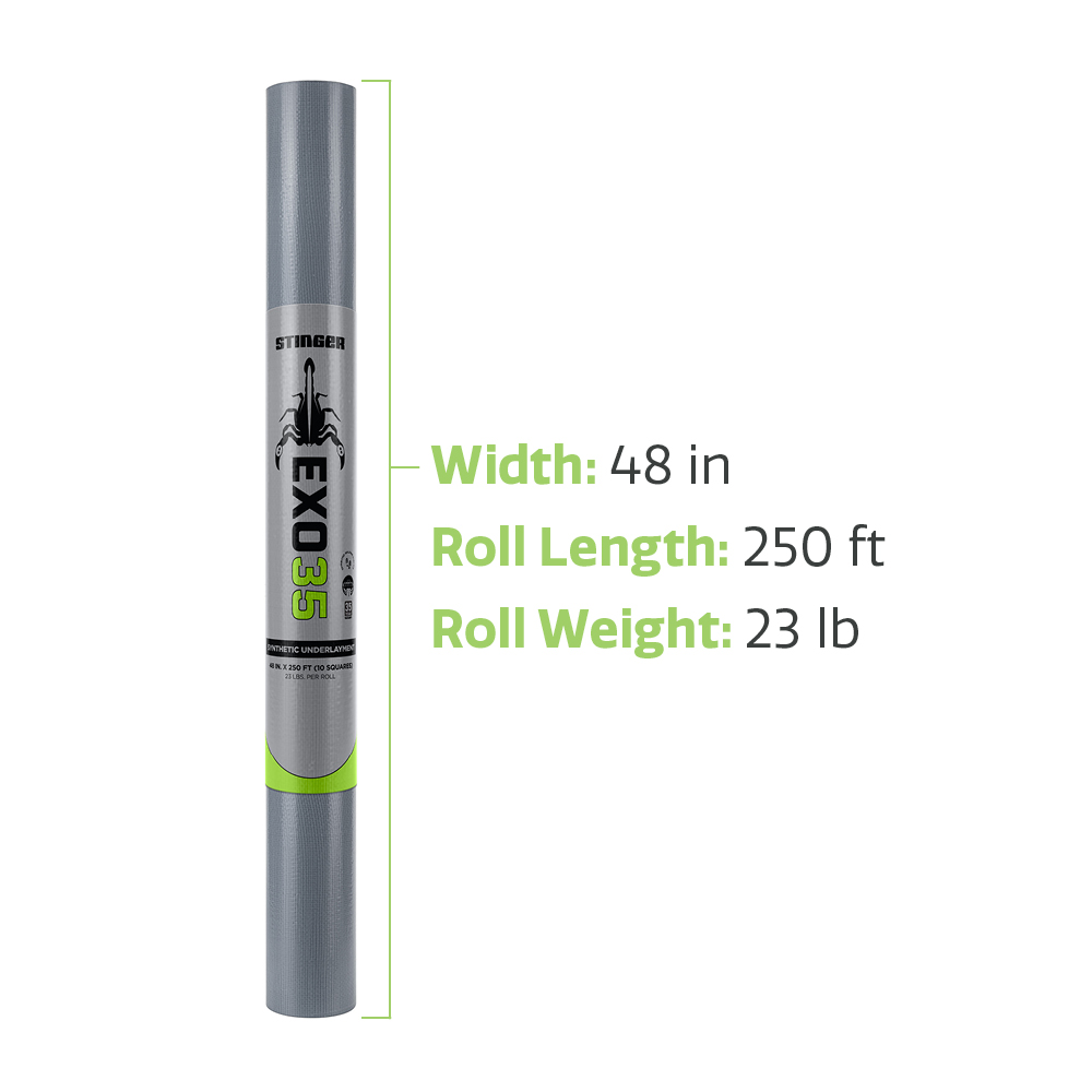 EXO35 Synthetic Roofing Underlayment combines industry-leading moisture protection with superior walkability, helping you get the job done safely and efficiently. Part of STINGER’s family of ICC-Certified synthetic underlayments, EXO35 is engineered for lasting performance and easy installation. Designed for compatibility with STINGER® cap fasteners, EXO35 is a critical part of a high-performance moisture management system that you and your customers can trust. With non-skid additives for enhanced slip resistance, EXO35 helps improve safety during installation, even in challenging conditions.