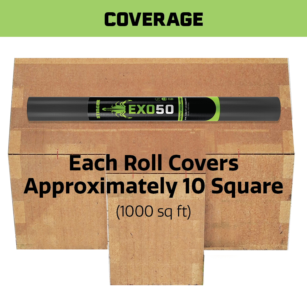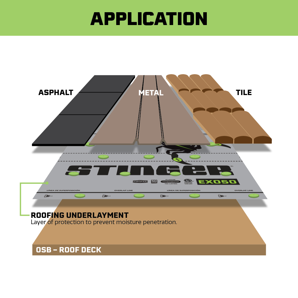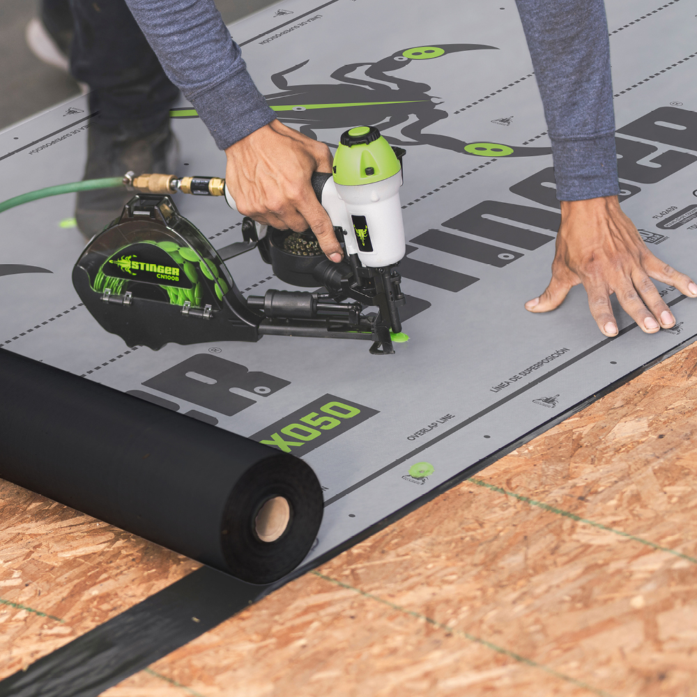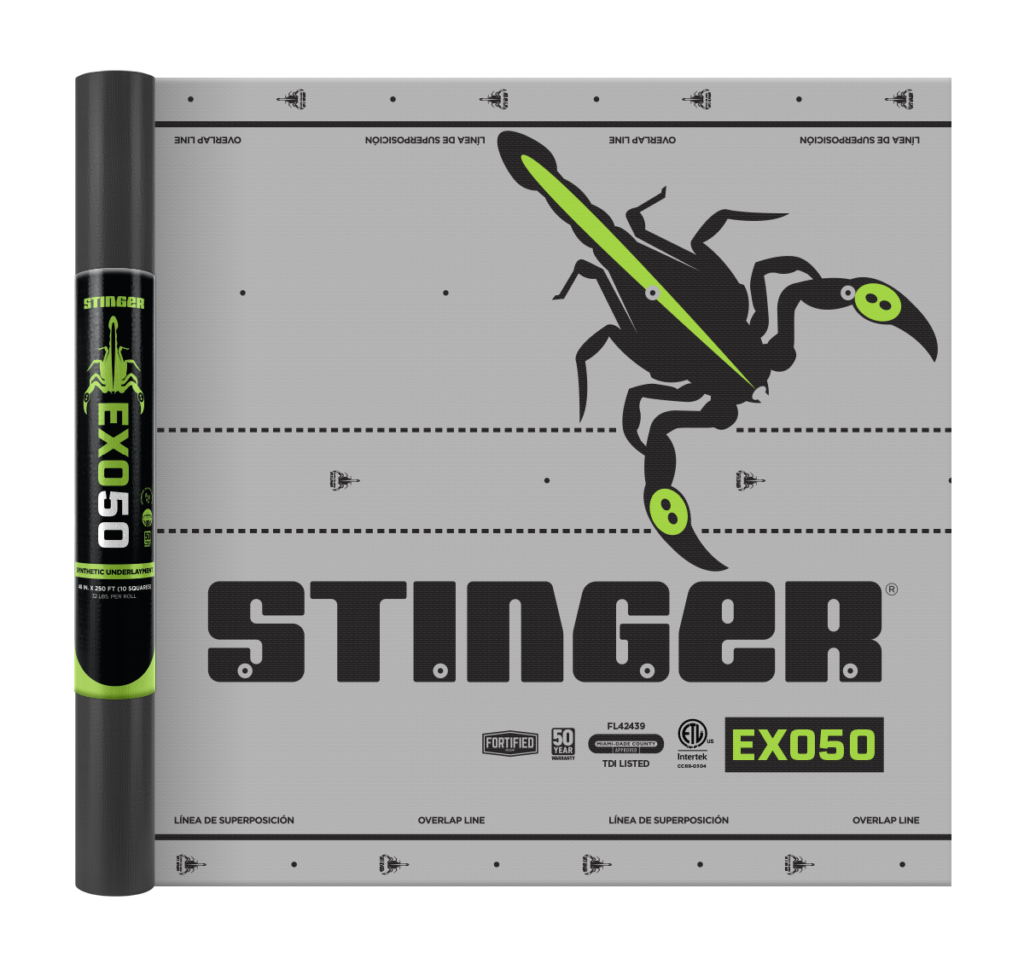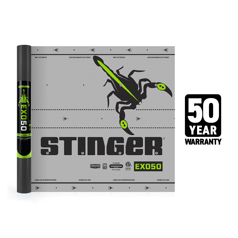 EXO50 Synthetic Roofing Underlayment combines industry-leading moisture protection with superior walkability, helping you get the job done safely and efficiently. Part of STINGER’s family of ICC-Certified synthetic underlayments, EXO50 is engineered for lasting performance and easy installation. Designed for compatibility with STINGER® cap fasteners, EXO50 is a critical part of a high-performance moisture management system that you and your customers can trust. With non-skid additives for enhanced slip resistance, EXO50 helps improve safety during installation, even in challenging conditions.